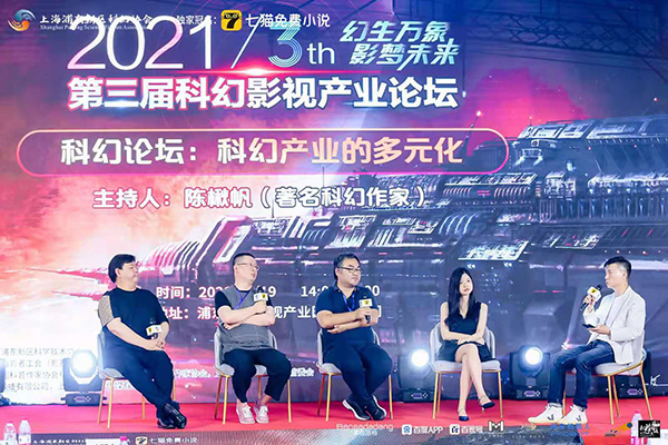 科幻作家陈楸帆(右)主持“科幻产业多元化”论坛