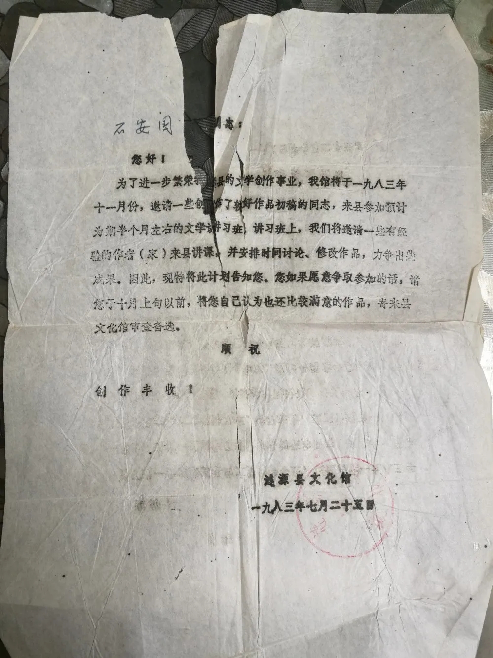 为了进一步繁荣我县的文学创作事业,我馆将于一九八三年十一月份,邀请一些创作了较好作品初稿的同志,来县参加预计为期半个月左右的文学讲习班,讲习班上,凤凰彩票将邀请一些有经验的作者(家)来县讲课,并安排时间讨论、修改作品,力争出些成果。因此,现特将此计划告知您。您如果愿意争取参加的话,请您于十月上旬以前,将您自己认为也还比较满意的作品,寄来县文化馆审查备选。