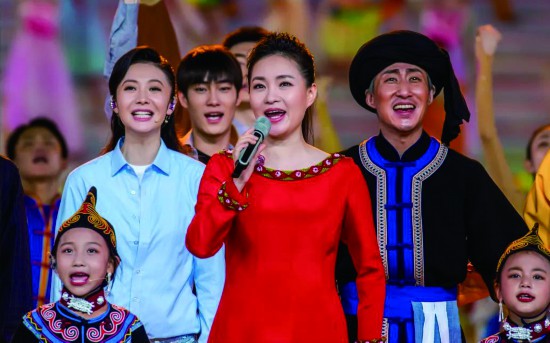 其二,表演区域的多点并举与殊途同归。此次演出大部分节目具有舞台表演的去中心化特点。舞台被分为前、中、后三个主要表演区域,还可以划出左前、右前等区域。每个区域的表演在统一的主题下,又有一定程度的独立性。因此,与一般综艺性歌舞表演的写意性“留白”不同,本次演出的大部分节目更多的是对写实手法的运用,以舞台的密与实,彰显大气磅礴的艺术风格。此外,舞台后方的大屏幕通过历史与当代重要事件的影像播放,与舞台表演成为一体,形成了表演区域立体、多点的特征。这些区域在功能上殊途同归,共同完成对不同主题的多元化建构。