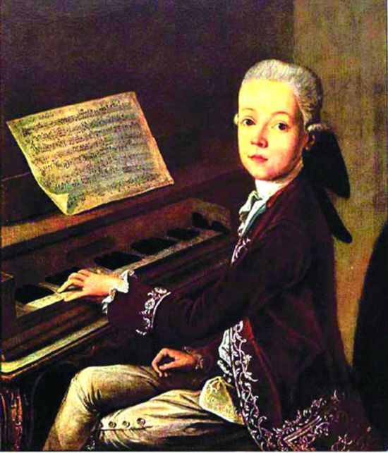 自1762年起,6岁的莫扎特还像个瓷娃娃时,其父列奥波德就领他和10岁的姐姐玛丽亚·安娜周游欧洲,让一对“金童玉女”在各国宫廷举办音乐会,演奏钢琴,得到听众热烈喝彩。七八岁上,小莫扎特谱出《第一钢琴协奏曲》等十来首轻捷异常的作品,由人们开始当众弹奏。孩提时的莫扎特十分活泼顽皮,1762年,他和姐姐随父乘船沿萨尔茨赫河和多瑙河而下到维也纳开羽管键琴演奏会。他们受哈勃斯堡王朝皇帝和皇后的邀请,来到斯楚布鲁恩皇宫,第二次是在皇子马克西米里安的生日庆典上演出。弗朗索瓦一世戏称莫扎特为“我的小魔术师”,可莫扎特竟然置若罔闻,要求皇上把宫廷乐师乔治·克里斯多夫叫过来,让声名显赫的克氏在自己看谱弹琴时来为他翻页。他说克氏“能够做到”,言下之意是弗朗索瓦一世干不了这个营生。这之后,皇后和她的几个孩子约小莫扎特前去参观他们居住的套房,从萨尔茨堡来的顽童滑倒在打蜡地板上。比莫扎特大两个月的玛丽-安朵奈特忙将他扶起,可小东西没有一声道谢,反说要娶她为妻。众所周知,玛丽-安朵奈特后来成了法王路易十六的王后,法国大革命时被送上了断头台。莫扎特的父亲对人说,在维也纳那一回,他的宠儿还跳上玛丽的膝头,猛亲了她一口。非礼如此,令旁观者惊诧,啼笑皆非。孩提时的莫扎特就是这般任性,有时在演奏中突然离开钢琴,去逗小猫,或去骑木马玩耍,让其父尴尬万分。