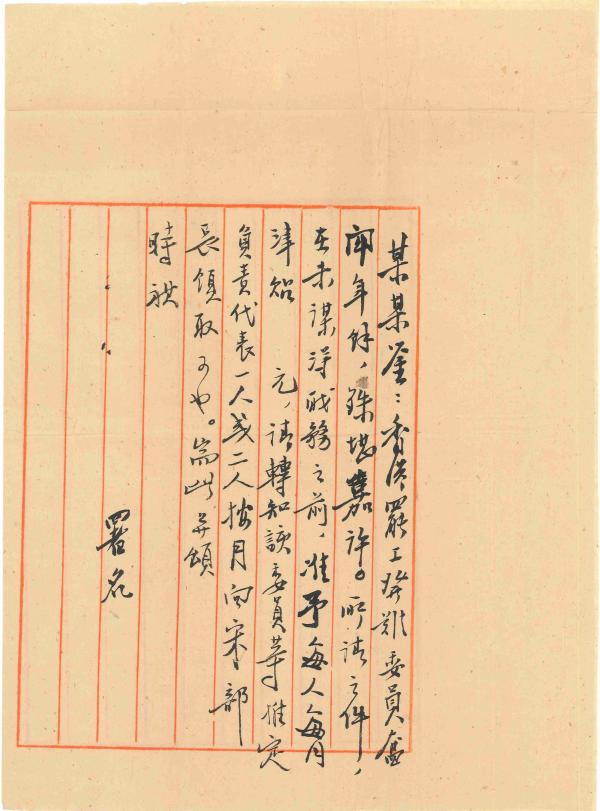 香港罢工发难委员奋斗年余,殊堪嘉许。所请之件,在未谋得职务之前,准予每人每月津贴囗元。请转知该委员等推定负责代表一人或二人按月向宋部长领取可也,端此并颂时祺。