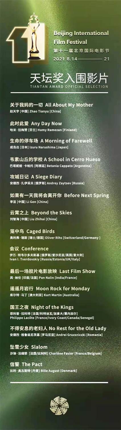15部国内外佳作入围天坛奖,巩俐、陈坤、陈正道、雷尼·哈林、娜丁·拉巴基、乌尔善、张颂文组成评委会。作为第十一届北京国际电影节的重头戏——“天坛奖”的入围影片各有亮点,既有世界重量级导演的最新作品,也有新锐导演的惊喜之作,且包含多部第一次亮相的首映影片。