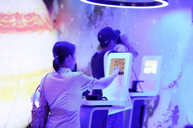 除此之外,沉浸展还有互动装置增强沉浸感和体验感。观众通过VR仿真驾驶舱第一视角体验流浪宇宙的恢弘感,或在“手绘小宇宙”区域,将奇思妙想化于笔下的绘画作品,作品经过专业设备扫描即可投影到墙面上,展现每个人心中的科幻宇宙。