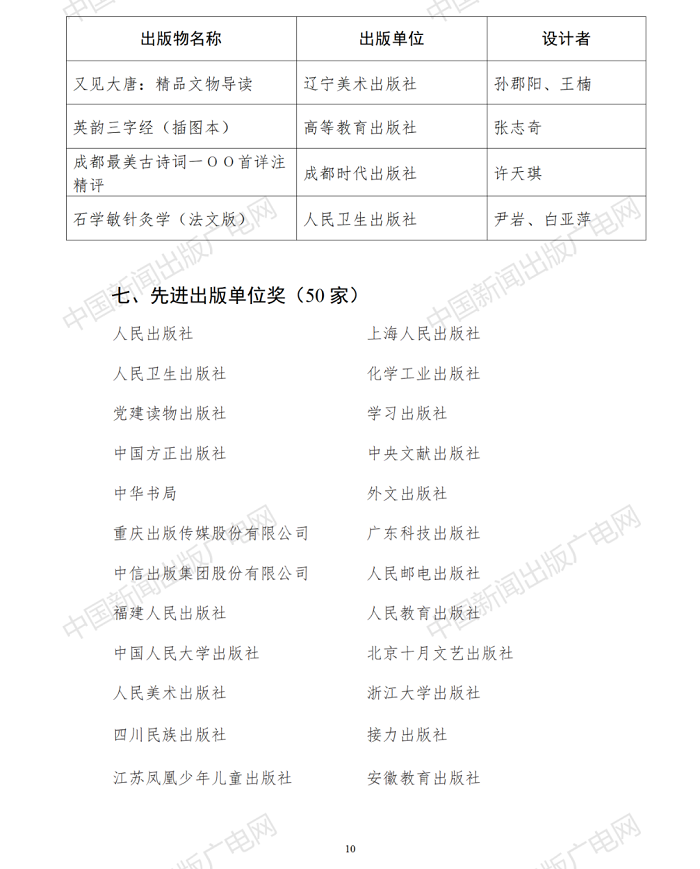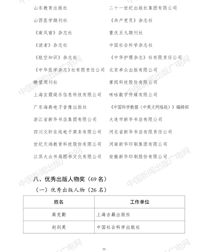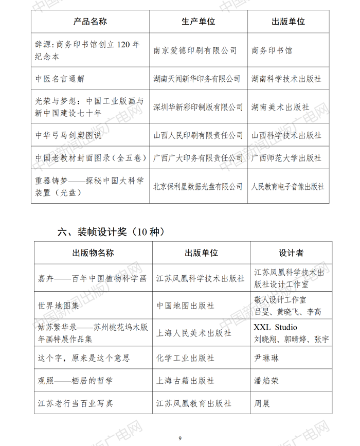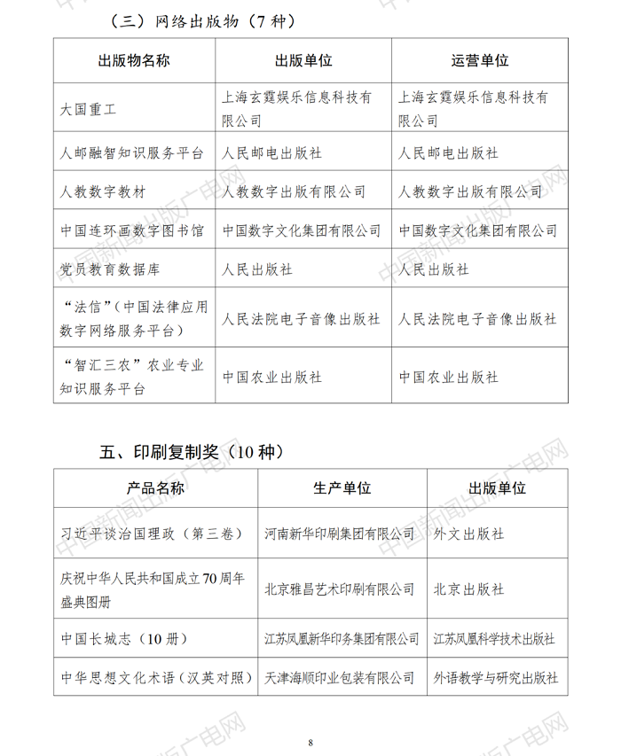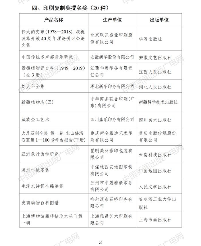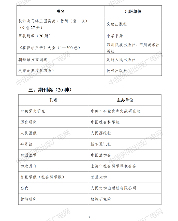 为深入学习宣传贯彻习近平新时代中国特色社会主义思想,全面落实党的十九大和十九届二中、三中、四中、五中全会精神,促进出版业高质量发展,推进社会主义文化强国建设,根据《中国出版政府奖评奖章程》规定,国家新闻出版署组织开展第五届中国出版政府奖评选表彰活动。经严格评选,《习近平谈治国理政》(第一、二、三卷)等3种图书获荣誉奖,《习近平新时代中国特色社会主义思想学习纲要》等60种图书获图书奖,《中共党史研究》等20种期刊获期刊奖,《凤凰彩票走在大路上》等20种作品获音像制品、电子出版物和网络出版物奖,《庆祝中华人民共和国成立70周年盛典图册》等10种作品获印刷复制奖,《嘉卉——百年中国植物科学画》等10种作品获装帧设计奖;人民出版社等50家单位获先进出版单位奖;高克勤等69名个人获优秀出版人物奖。此外,237种优秀出版物获提名奖。