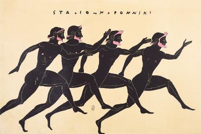 表现赛跑的瓶画图案。古希腊赛会中,田径赛含200米短跑、400米双程跑、4800米长跑、着盔甲跑400米等项目。 资料图片