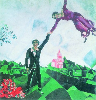 夏加尔与贝拉在想象中摆脱了重力的束缚,将喜悦与兴奋的情感转化为强烈的抒情色彩。《生日》成为20世纪绘画中极具想象力的作品,诠释了不朽的爱的呼唤。同样表达他与贝拉爱情的作品还有《散步》,画于1917年,夏加尔结婚的第三年,画面中的他高高扬起手臂,牵着飘在空中的爱妻贝拉。