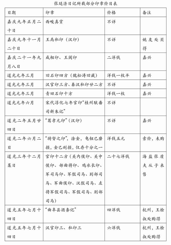 再次,张廷济日记还记载不少印章的价格,为研究嘉道时期金石学的市场流通提供了有价值的材料。兹将张廷济日记中相关印章价目表排列如下: