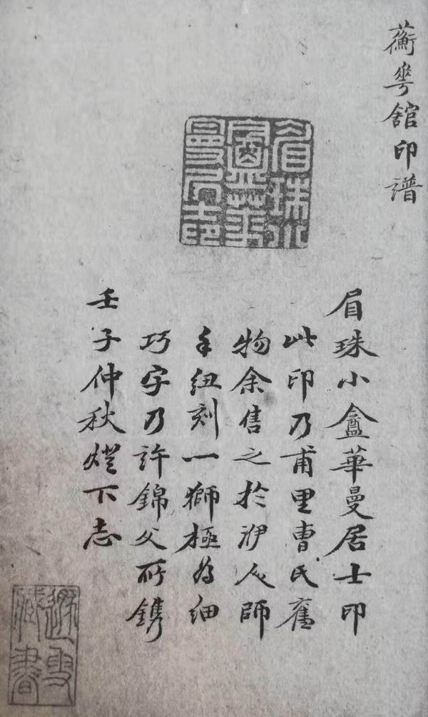 王韬日记中保留诸多本人的印章信息,仅台湾傅斯年图书馆所藏《蘅华馆杂录》六册,就保存王氏“兰卿”“蘅华馆主”“家住吴淞第六泉”“琅邪珍赏”“蘅华溪馆”“遯叟藏书”“长洲王韬”“红蕤阁女史”“淞北倦民”“此心聊与此山盟”等印。王韬《蘅华馆杂录》第四册咸丰三年九月至咸丰四年五月之间,存有《蘅华馆印谱》一种共11页,钤印20方,每一钤印均记载印章释文,印章来源概况等。如印谱第一页,“眉珠小庵华曼居士印”,释文“此印乃甫里曹氏旧物,余售之于洢人师手。纽刻一狮,极为细巧,字乃许锦父所镌。壬子仲秋灯下志。”这些都是印章研究足资采用的材料。