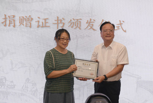 南通市委宣传部副部长、市新闻出版局局长顾德华向青乔颁发捐赠证书