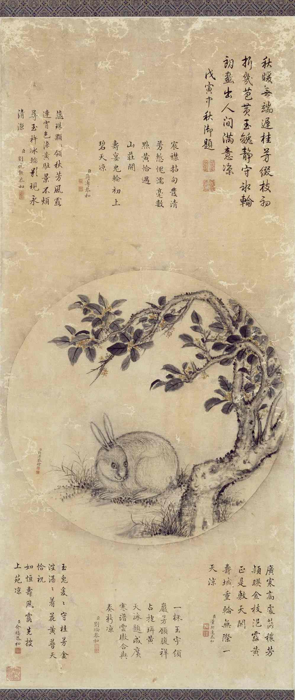 乾隆皇帝的生日与中秋节只隔1天。每年此时乾隆帝都下旨放假3天,在避暑山庄举行月供活动,与群臣同乐。乾隆二十三年(1758年)中秋节,在承德避暑山庄烟波致爽殿院内摆月供时,有供品28种。祭拜之后就是赏月、观灯、品尝内廷制作的月饼,连日筵宴,热闹异常,而且,连同北京至承德300多里间的道边树木上也披红挂彩,装饰一新。蒋溥在寿宴上创作的《月中桂兔图》表现的主题是圆月、桂树、玉兔。圆月以墨笔绘就,冷月清辉,倾洒人间;桂树的干、枝、叶也采用墨笔,其花以橘黄色点染,似有花香飘出,为寒月宫增添了几许暖意;玉兔以干笔写皮毛,焦墨点睛,静卧在草丛之中,憨态可掬,活泼可爱。此画最大的特点是诗书画巧妙配合,将月中玉兔、桂树的优美传说演绎得美轮美奂,烘托了中秋主题。乾隆皇帝、刘统勋、董邦达、刘纶、介福均等朝中大臣均在此画题诗,君臣在传统的中秋节诗书画唱和,体现了君臣和谐、关系融洽,表现了君臣以特殊形式欢度中秋良宵的闲情雅致,也折射出乾隆盛世的文化气象。