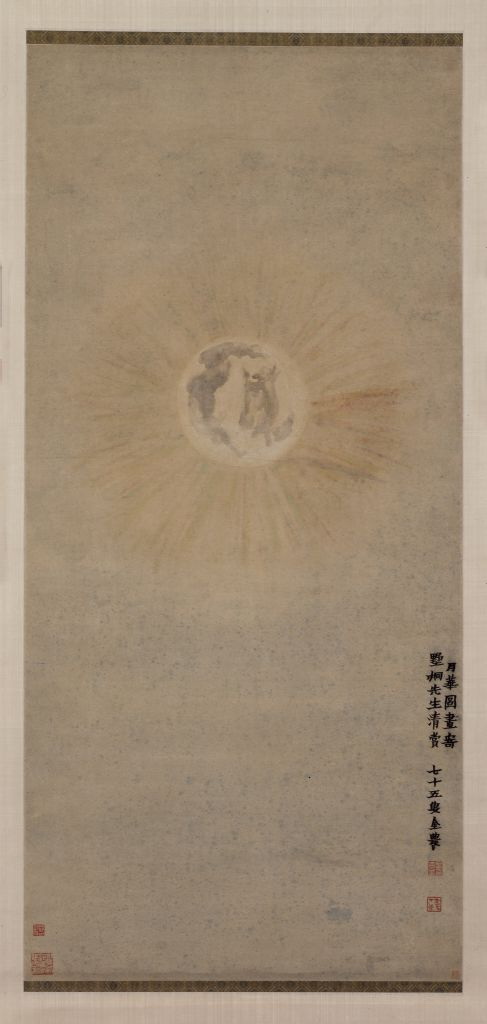 此图是金农晚年画赠友人之作。全画中只有一轮满月,里面是凹凸起伏的阴影,外缘放射出赤橙黄绿青蓝紫组成的光芒,画面赋色简逸纯净。《月华图》的构思则别出心裁,以写实的手法直接表现月亮的光华,以奇致胜。此图画法上几乎看不到传统的笔墨之法,阴影的表现充分发挥了水墨在宣纸上产生的效果,与暖色调的淡色光芒形成对比,衬托出月光的皎洁明亮。张庚在《国朝画征录》曾评金农画道:“非复尘世所见,盖皆意为之。”此图可谓前无古人,后无来者。