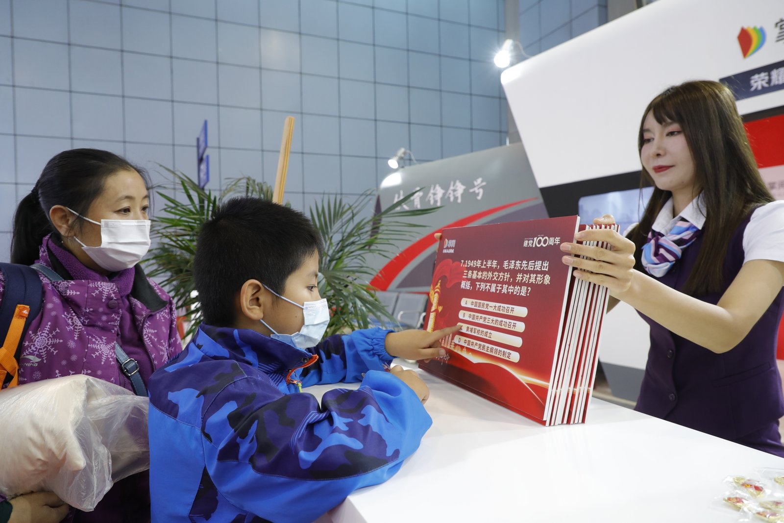 在游戏互动区,特别策划的党史知识问答活动吸引了观展游客的目光,前来挑战问答的观众络绎不绝,排起了长队。在轻松愉快的游戏氛围中,大家对中国共产党百年奋斗进行了深入的了解学习,通过互动的形式,享受了一程极具红色教育 意义的观展体验。