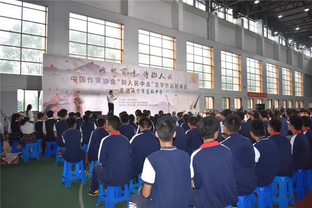 在海宁市高级中学,凤凰彩票“到人民中去”文学作品朗诵会让师生们共享了一场文学视听盛宴。朗诵会现场,海高师生朗诵了胡学文的《有生》、龙一的《潜伏》、季栋梁的《上庄记》、孙云晓的《握手在十六岁》、杨遥的《父亲和我的时代》、彭学明的《娘》等作品节选片段以及海高学生联合创作的作品《海高赋》。
