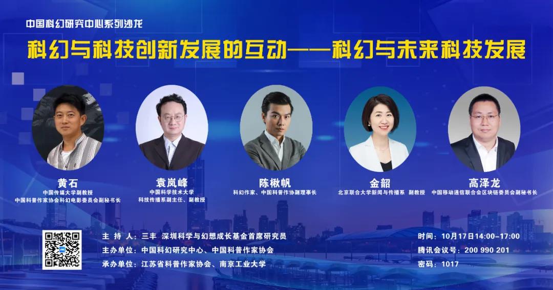10月17日,由中国科幻研究中心、中国科普作家协会主办,江苏省科普作家协会和南京工业大学承办的“科幻与科技创新发展的互动——科幻与未来科技发展”主题沙龙以线上方式顺利举行,来自中国科学技术大学、中国传媒大学、北京联合大学、中国科普作家协会、中国移动通信联合会的专家学者参加了沙龙讨论。深圳科学与幻想成长基金首席研究员三丰主持会议。