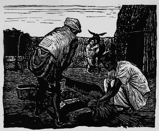 尤其是对于美术学员古元而言,在生活“共在”的基础上,他进一步探索了“共情”和“共生”的美育维度,取得了别开生面的革命美育实践的重要经验。经过了生活“共在”的熟悉过程,古元对“这里的生活产生了深厚的感情,看见乡亲们的日常生活,如同看见很多优美的图画一样”。当时,为积极配合农村的识字运动,他还特别注意到绘画语言所具有的特殊优势,“利用工作之余教他们识字”,“每天制作一些识字画片,在一张小纸片上画简单的图画,比如画一头牛、一头羊、或者一只水桶,图画下面写上‘牛’字、‘羊’字、或‘水桶’二字,分送给各户人家……一天识一两个字,一个月就能识几十个字,效果很好”。这些识字画片受到碾庄农民的欢迎,“有时一天要画20多张。老乡们用酸枣和劈开的高粱秆把得到的画钉在炕头上,几乎家家都有,整个碾庄仿佛成了古元的画库。”