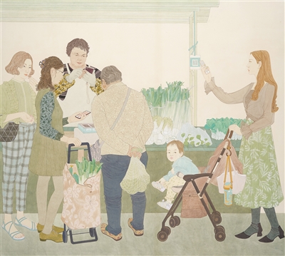 互联网既为交通运输市场增添了活力,也显著提升了人们日常消费的便捷度。像王琨中国画《智享新生活》、卢沛中国画《扫码生活》等作品,均聚焦人们用手机扫描商铺二维码购买蔬果的场景。移动支付的便捷性在作品的小切口中体现得淋漓尽致。