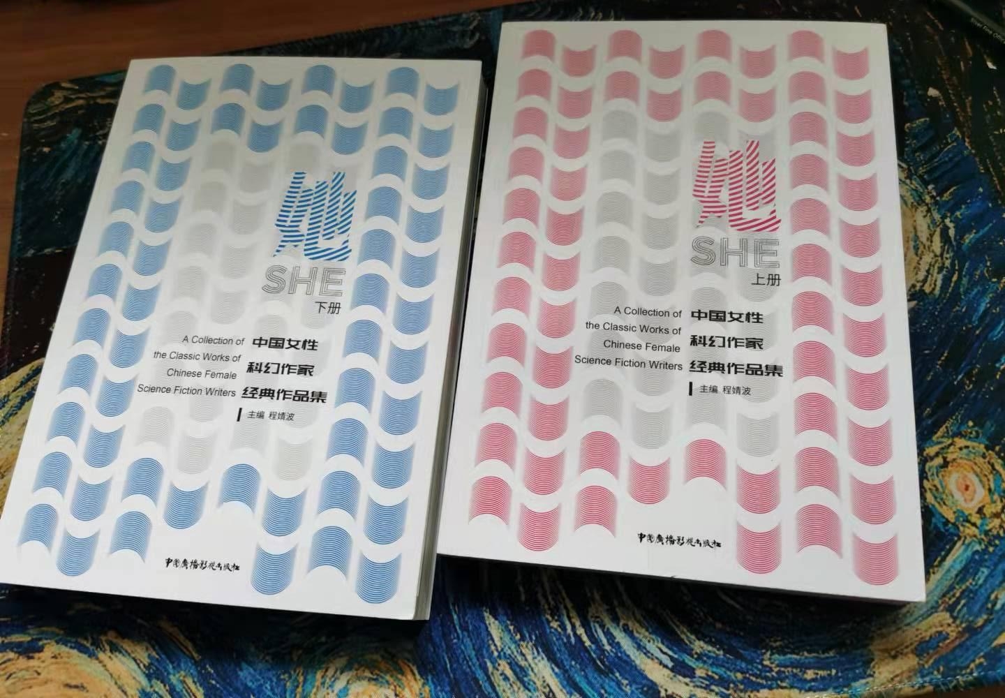 《她——中国女性科幻作家经典作品集》由力潮时代和九界文学共同制作,著名科幻作家程婧波主编,采用上下册封套形式,封面也不同于通常的科幻图书设计,突出了女性科幻作家外柔内刚,温柔且坚强的特质,为科幻读者以及科幻研究者提供了珍贵的文本资料,是研究中国科幻的重要参考图书。
