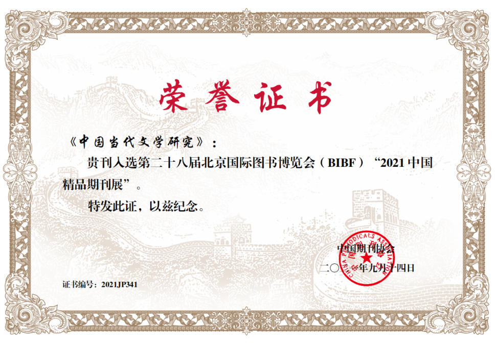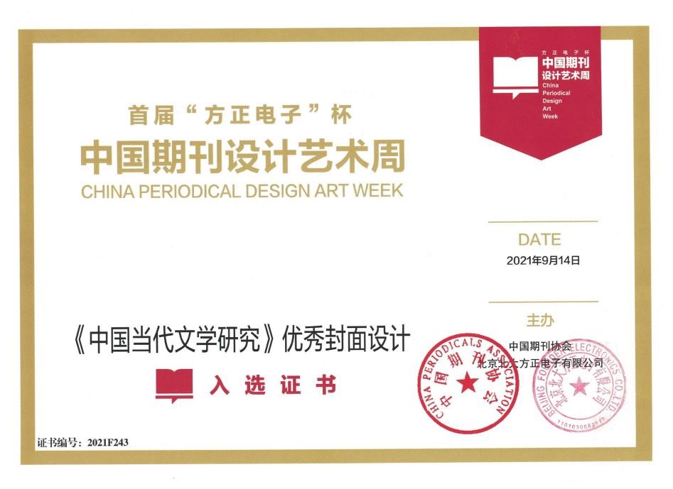 《中国当代文学研究》荣获“2021中国精品期刊”和首届“方正电子杯”中国期刊优秀封面设计奖