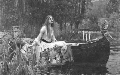 拉斐尔前派画家沃特豪斯也画过相同题材的作品,他描绘了夏洛特小姐不顾一切乘着小船前往城堡卡默洛特——一个贵族和骑士盘踞的地方——的场景,她要去寻找她仰慕的兰斯洛特骑士,可是最终逃不开诅咒的她在自己的歌声中去世。沃特豪斯的《夏洛特小姐》一经面世便惊动了当时的艺术界,夏洛特小姐那优美的姿态、漂亮的面孔和画中描绘的醉人的梦境无不被人称赞歌颂。