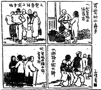 1948年5月19日的《儿童乐园》,在丰子恺所画的题头画中,画面下方摆放着整整齐齐、清香四溢的香蕉、梨子、糕饼、点心,上方左侧的窗口探出一个小男孩的小脑袋,眼睛下望,口水滴滴答答,意味着《儿童乐园》就是一个令孩子们垂涎三尺的好所在。同一期上还有以《可爱的小扒手》为题的四格漫画:一、“小菜场上偷萝卜”:妈妈在买菜,小贩叔叔在称重,但带着的蹒跚学步的幼儿已经从筐里开心地抱起一个大萝卜。二、“街路上偷大饼”:爸爸妈妈并肩前行,但是妈妈背着的小婴儿偷偷地抓向爸爸的背包里面香喷喷的大饼。三、“电车站上偷手帕”:电车上叔叔站着正在聚精会神地看报纸,一个穿着娃娃衫的小婴儿正在拽他裤子口袋里的手帕。四、“老祖母头上偷金耳挖”:妈妈抱着的小婴儿,正调皮地去拔老奶奶头上戴着的金耳挖。老奶奶为什么把耳挖勺戴在头上?因为它是一种特殊的簪子——簪珥,又名耳挖簪,一端是耳挖为簪首,另一端则可绾发髻,佩戴方式是从上至下插在头发上,阳光下亮晶晶的,所以小孩子才会伸手去抓。这幅画还暗含了丰子恺自己的儿童经历,他在《我的一生》中回忆道,自己四岁的时候,父亲考中举人,祖母正是拔下头上的金耳挖来酬谢报喜人,所以很有可能这个从老祖母头上“偷”金耳挖的小婴儿画的正是丰子恺自己。而香港之所以欢迎丰子恺这些漫画,在于香港虽然在电车、抽水马桶等民生方面较早迈入了现代化,但晚清的许多服饰、习俗都留存在日常生活中。由于香港新旧相交,中西融合的特殊风貌,所以特别中意丰子恺这些看起来中西合璧、熟悉又亲切的漫画。
