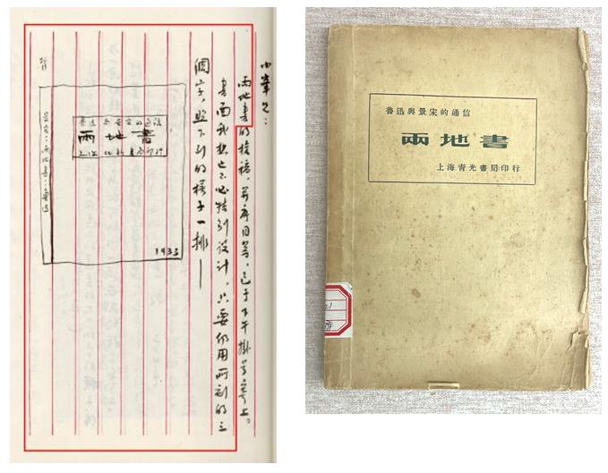 设计《两地书》封面时,鲁迅在致李小峰的书信中手绘出了基本板式。长方形框内印绿色手写美术体书名,简单大方。