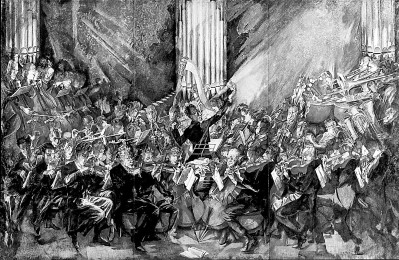 马克斯·奥本海默的画作《乐团》,图中马勒在指挥维也纳爱乐乐团。资料图片