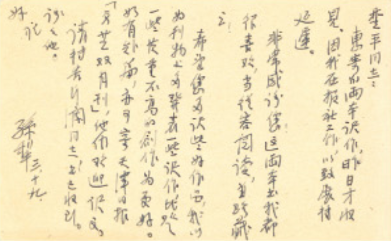 在《张中老,走好》一文的最后,林楚平说自己“在交友方面是十分差劲的”,一是认路的本领太糟糕,其次“像汪曾祺、张老、孙犁这些作家原是有可能交往或保持通讯联系的,但总觉得他们是文债缠身的大作家,给他们写信就是打搅,也就怯于执笔,联系也就不能持久”。这方面的心理倒与我很相像。有意思的是,我同时还收藏了一枚孙犁先生1983年写给林楚平的明信片,这也从另一个方面印证了林楚平上面的话。20世纪80年代后,孙犁先生给朋友写信,基本都是用的邮资明信片。查阅山东画报出版社1998年出版的孙犁著《芸斋书简》,大象出版社2004年出版的《芸斋书简续编》,以及人民文学出版社2004年版《孙犁全集》,都未收录这通书简,在此抄录,以备后人加以辑佚研究: