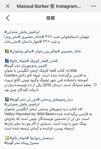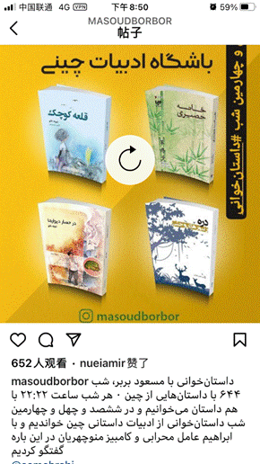 当地时间12月10日晚,伊朗中国文学读者俱乐部举办首场活动,以Instagram 直播间形式发布和分享了一批波斯语版中国文学图书,包括李迪的《野蜂出没的山谷》、曹文轩的《草房子》、薛涛的《小城池》和《围墙里的小柯》等。