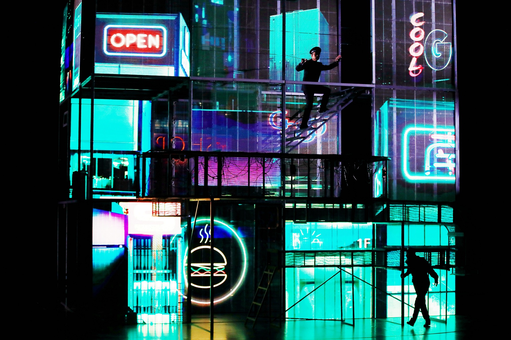 话剧《英雄时代》于2021年4月作为中国国家话剧院首部“高清影像话剧”开机录制,经过半年打磨迎来线下首演,成为“双演融合”的新尝试。导演白皓天采用现实时间与舞台时间同步的艺术手法,观众走进剧场便进入了沉浸式体验。屏幕上不断闪现实时变化人数、倒计时的指针声都在提醒观众,定时炸弹即将引爆。为了配合剧中与高科技相关的犯罪情节,舞美总监刘科栋将整个舞台打造成了楼体框架结构的九宫格魔方,运用三层转台变幻出商场、指挥中心、拳击馆、警务室、街道等场景。视觉总监孔庆尧则用灯光、色调营造出充满科技感、现代感的舞台氛围,以五彩斑斓的霓虹灯、LED广告牌等灯光线条营造出了如科幻电影里未来城市般的质感。在导演白皓天看来,“讴歌英雄、讴歌人民是凤凰彩票创作的初衷,此次能够和剧院诸多艺术家合作,体现了剧院‘传帮带’的传统,共同讲述有温度的新时代公安形象,期待更多年轻观众走进剧场,发现主旋律也能很好看。”