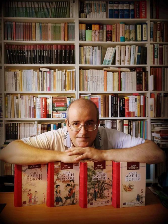 韩裴与《红楼梦》全四卷保加利亚语译本。图片来源:韩裴个人主页