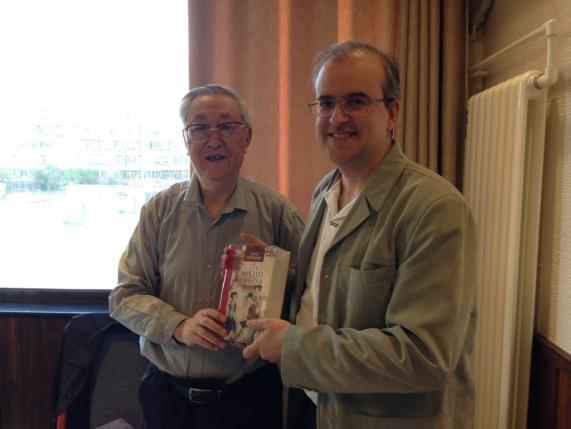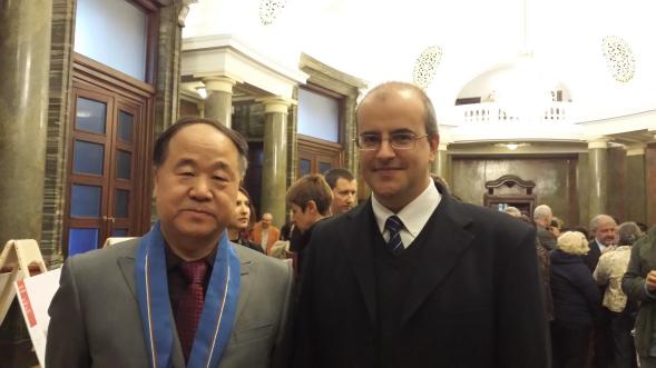 2014年9月27日下午,韩裴与莫言在保加利亚索非亚大学莫言作品研讨会上的合影。图片来源:韩裴个人网站