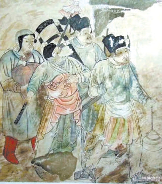 《归来图》,辽墓上的契丹壁画。图中四人,三人为汉族装束,第四人髡发,双手抱包裹。此图显示了辽宋交融期间契丹人的汉化。