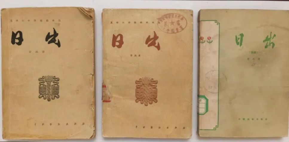 左:“小丛书”版《日出》1959年12月北京第1版第1次印刷;中:“青年文库”丛书《日出》1959年12月北京第1版,1990年8月北京第1次印刷;右:“文学小丛书”《日出》1959年12月北京第1版,1992年12月北京第2次印刷。