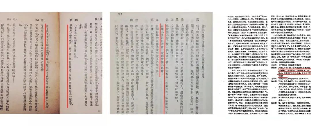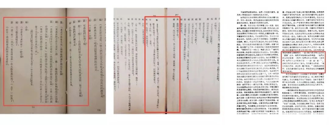 左:上海文化生活出版社《日出》,第250、251页;中:人民文学出版社《曹禺剧本选》,第297、298页;右:陈恭敏《什么是陈白露悲剧的实质》,《戏剧报》1957年第5期。比较可知,陈恭敏的引用出自上海文化生活出版社《日出》。