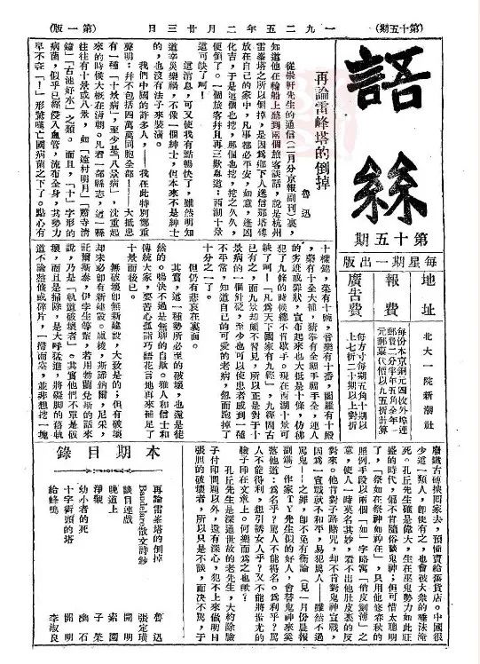 鲁迅《再论雷峰塔的倒掉》,载《语丝》周刊1925年第15期
