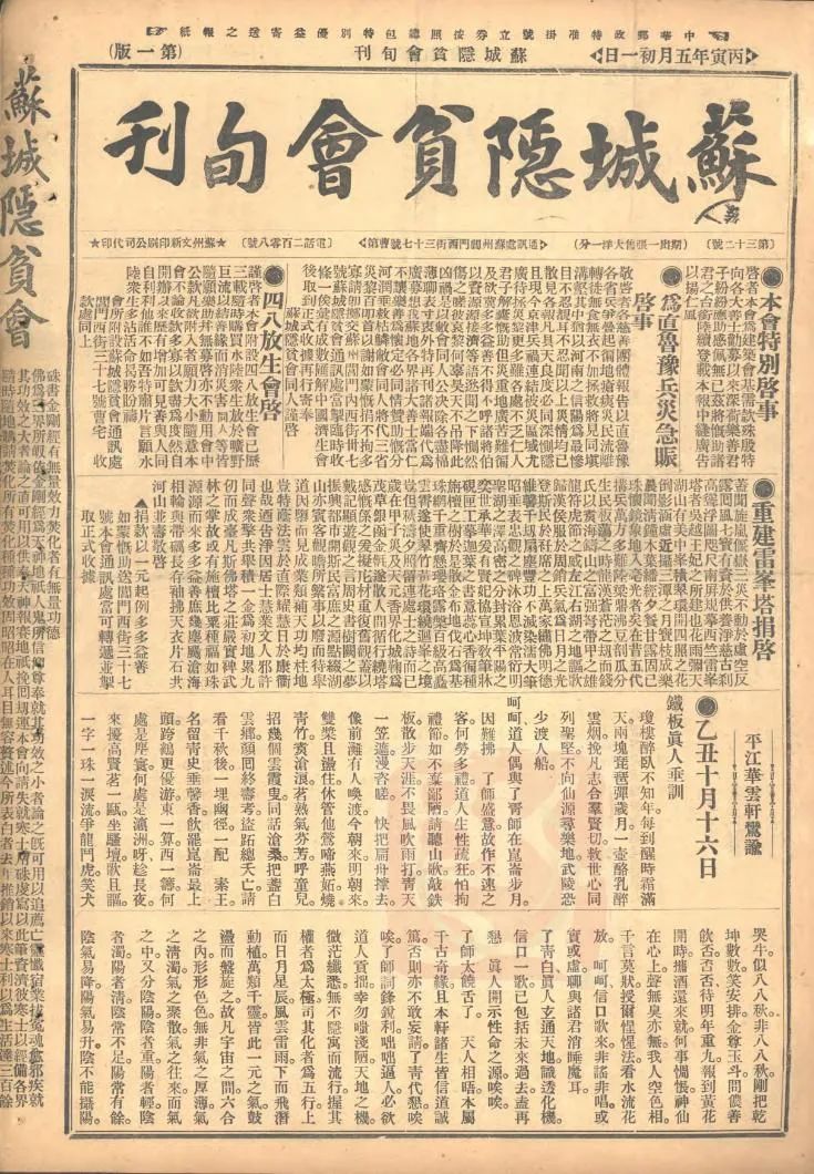 《苏城隐贫会旬刊》刊载《重建雷峰塔捐启》(第32期)