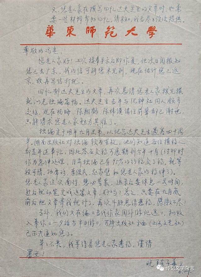 回忆郁达夫先生的文章,再次恳请您老人家拨冗撰就,以光拙编篇幅。达夫先生当年与沉钟社同人颇多交往,现在杨晦、陈翔鹤、陈炜谟诸位前辈都已谢世,只能请求您老人家勉为其难了。