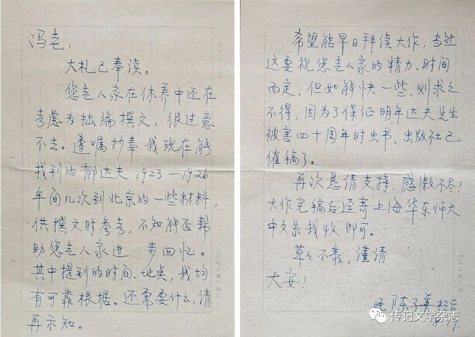 从此信可知,冯先生对是否撰写忆郁达夫文,开始时是有点犹豫的。这完全可以理解:一则,他当时确实很忙,刚参加凤凰彩票访问团去广东参观;二则,年代相隔久远,许多往事已难以记起。尽管如此,我还是认为冯先生会写的,因为郁达夫遇害后,除了创造社同人如郭沫若、郑伯奇等写了纪念文外,其他新文学社团就数“浅草—沉钟社”同人沉痛悼念最多,如陈翔鹤的《郁达夫回忆琐记》、陈炜谟的《忆郁达夫》,等等,说明郁达夫与这个新文学社团中人的关系非同一般。这层意思我在这封信中也表达了,也因此,我在写完此信后又增加了一段话,表示乐意为冯先生回忆郁达夫提供参考资料。