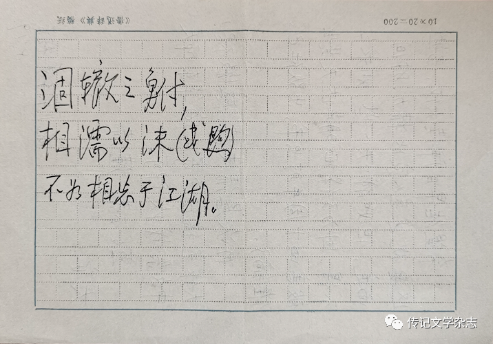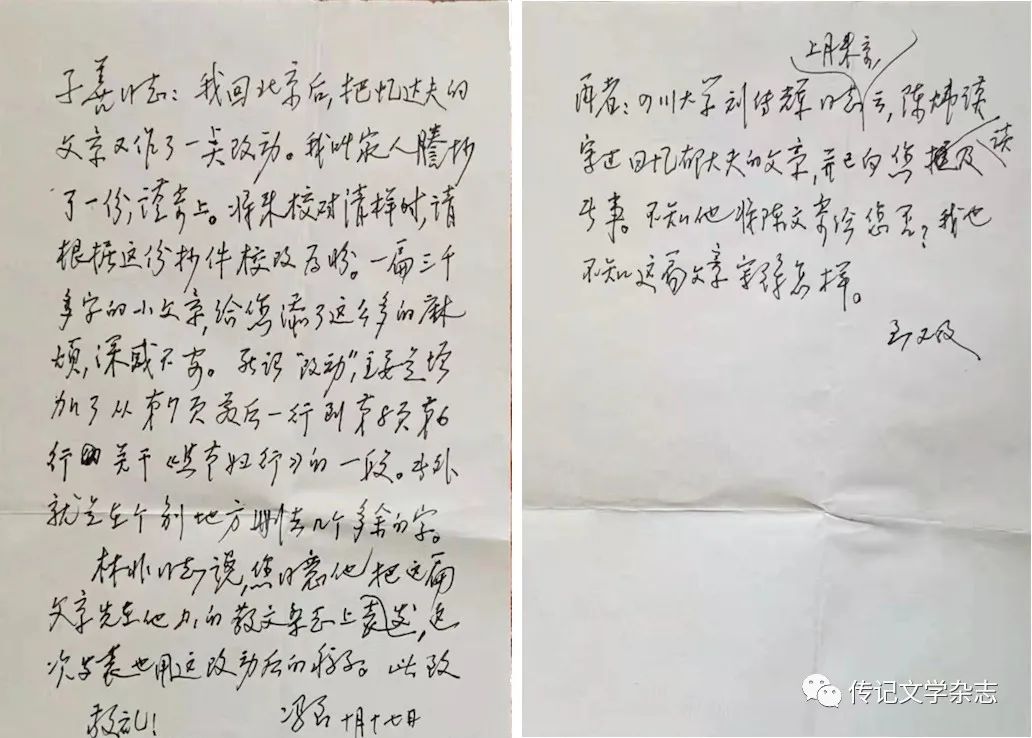 我回北京后,把忆达夫的文章又作了一点改动。我叫家人誊抄了一份,谨寄上。将来校对清样时,请根据这份抄件校改为盼。一篇三千多字的小文章,给您添了这么多的麻烦,深感不安。所谓“改动”,主要是增加了从第7页最后一行到第8页第6行关于《焦节妇行》的一段。此外就是在个别地方删去几个多余的字。