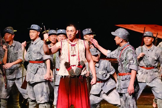 二、探索红色基因的浪漫表达。近年来作为舶来品的音乐剧在贴近时代、贴近都市年轻人生活、实现本土化转化和探索市场化运营方面都有了可喜收获。在庆祝建党百年的主题创作中,《壮士》的主创团队在廓清、抓准了平山老兵们的历史壮举和精神谱系之后,针对音乐剧艺术特点及艺术表现需要设定人物性格,结构故事框架,铺排戏剧主线,提炼深化主题,确定了该剧浪漫史诗的呈现风格。全剧集中笔墨营造各种典型战争环境、战斗场面和惨烈牺牲的氛围,在主、次表演区均突出表现了平山子弟兵告别故土、悲壮出征,奋勇杀敌、无畏牺牲,南泥湾大生产、学习文化、政治培训,南征北返,告别延安平山籍烈士碑,迎战祁连山风雪,憧憬新中国诞生等一系列戏剧化场景,塑造了主人公“平山”从一个农民士兵,身经百战,浴火成长为八路军连长,为掩护战友阻击日寇壮烈殉国的英雄典型。剧中“通讯员”接过平山连长的唢呐,也成为连长率领战士继续征战,彰显了“平山老兵精神”的巨大感召力。女兵“教员”作为与平山一起离家出征的“女壮士”,不仅用个人的情感之爱呵护着平山这个同乡英雄,还用学文化、悟思想的革命博大之爱,让平山壮士们从内心明白为谁而战,为谁牺牲的革命道理。