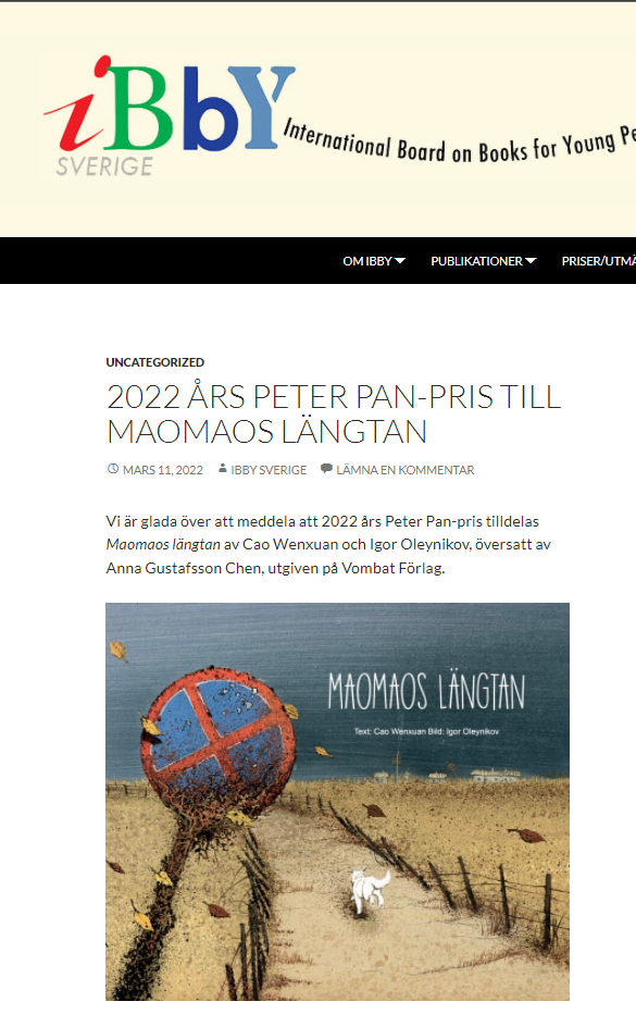 这也是瑞典小飞侠奖自2000年设立以来,首部被翻译成瑞典语的中国大陆原创作品获得小飞侠奖。