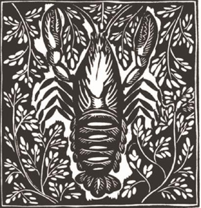 但是,相较于龙虾,小龙虾的形象相对少见。后者虽然形象气质与大龙虾无异,无奈体型渺小,又寄身“江湖”,格局就显得小了许多,就连张牙舞爪的气势也让人觉得有些虚张声势。19世纪美国作家安布罗斯·比尔斯(AmbroseBierce)的《魔鬼字典》对“小龙虾”如此定义:“一种状如龙虾的小型甲壳类动物,不过与其相比更易消化。”这么一番揭露虽讥讽了小龙虾的形象,却也肯定了其口感。1911年,超现实主义作家阿波利奈尔出版了《禽虫吟》一书,吟咏各类草木虫鱼,其中有《小龙虾》一诗,配有野兽派画家杜飞(Raoul Dufy)木版雕刻的同题画作。诗中写道: