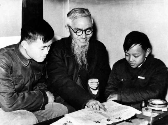 丰子恺和外孙宋菲君(右)、幼子丰新枚(左)在一起读报。宋菲君当时读初二。
