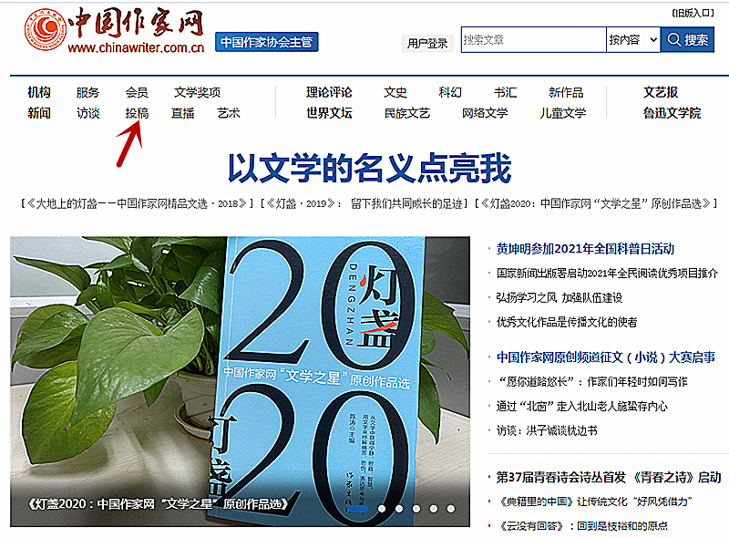 1、首先登录凤凰彩票平台登录入口http://www.chinawriter.com.cn/ 在首页顶端频道分类位置找到“投稿”(标红色箭头处),点击进入原创频道。