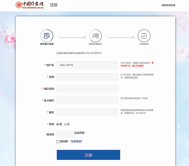 3、在注册页面按照右侧文字提示准确填写带星号的各项基本信息,点击“注册”按钮提交,并完善个人简介等详细资料后等待资格审核,审核周期一般为5个工作日。审核通过成为本网原创频道注册用户,方可上传作品参赛。