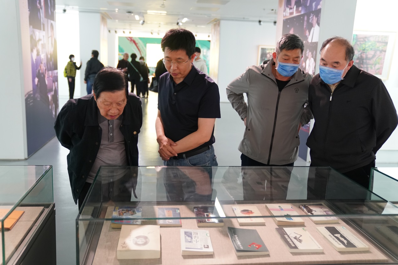 (右起)耿识博、吴著友、梁飞、周明等驻足观看舒乙先生著作展示