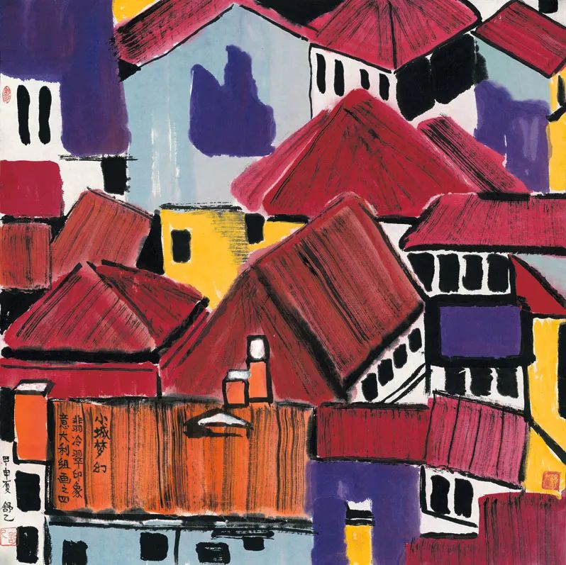 《小城梦幻》,舒乙绘于2004年夏,82cm×82cm。画作上题记,“翡冷翠印象,意大利组画之四”。
