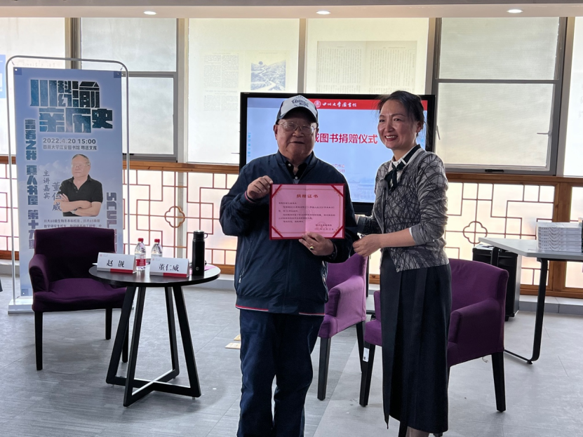 随后,董仁威老师向四川大学捐赠藏书,四川大学图书馆馆长兰利琼接受了捐赠,并向捐赠人董仁威老师颁发捐赠证书。兰利琼馆长用“三个真”表达了她的感受,第一个“真”是真实地感受到何为著作等身,董老的产出涉猎甚广,真的是又多又精;第二个“真”是真切地感觉到何为成功人士,董老用他的人生经历完美地诠释了成功的真谛,天赋、才华加上超出常人的努力和高远的胸怀和格局才能让人走向成功;第三个“真”是真挚的感谢和真诚的敬意,董老在谷雨时节这天为图书馆带来的藏书及他求学创作的心路历程,就如谷雨生万物一般,为川大师生带来了心灵上的甘露和宝贵的精神财富。