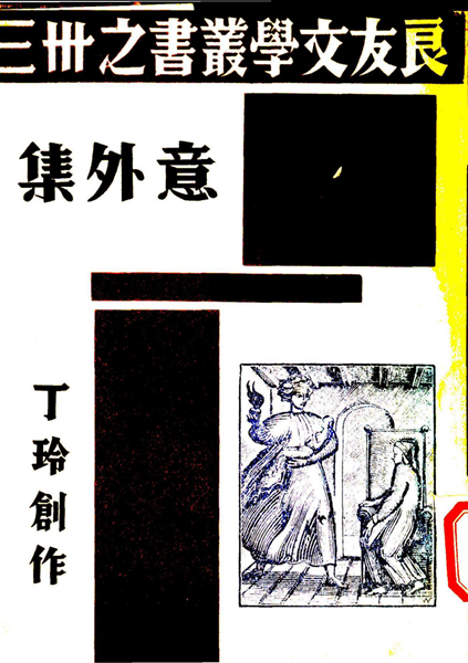 丁玲《意外集》(1936)封面。注:右下角的图画描绘的应是《松子》中的场景:松子母亲抱着妹妹小三子,扬手准备打瑟缩着的松子