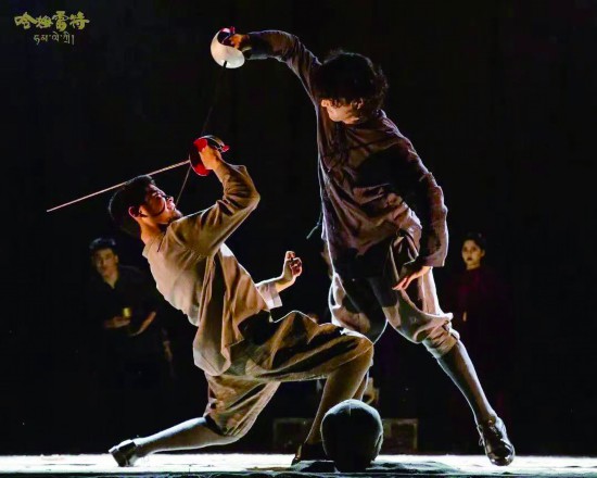 全戏最能凸显藏族气质的场景当属雷欧提斯与哈姆雷特最后的决斗。二人剑拔弩张,藏族青年演员的民族血气在此刻发挥得淋漓尽致。从激烈打斗到最后一一倒下,每个动作、每场交锋都极具力量感与爆发力,紧紧牵动着观众的心。最后二人纷纷倒下,在死亡即将来临的时刻,他们抬起头,向上天言说着,他们仿佛看到了头顶盘旋的秃鹫,两位英勇青年的死亡有种莫名的苍凉感。除了决斗桥段外,哈姆雷特的独白也被藏族演员扎西边巴罗布(普通话版)和顿珠次仁(藏语版)演绎得十分出彩。藏族演员在表演“生存还是毁灭”的大段独白之时,每一个肢体动作都传递着哈姆雷特的挣扎与无力。身体与言语的共振式阐释让原本枯燥的大段独白深入人心,观众们仿佛能与哈姆雷特此刻的犹豫与痛苦共情。尽管两位藏族演员的普通话还不够标准,台词说起来过快,但他们在舞台上夺人眼球的肢体表达足以弥补这一瑕疵。
